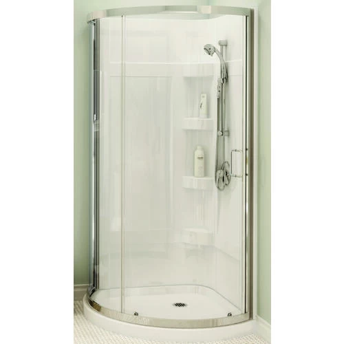 34 in x 34 in wall width round base, low 3 in threshold allowing an easy and safe access, smooth and silent roller system, chrome frame, 5 mm tempered glass, left or right shower door opening. 76 in H. 3 years warranty. Two-piece polystyrene/acrylic wall with four shelves, acrylic/ABS textured base.