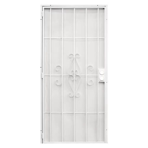 Decorative design scrolls, 5-1/2 in vertical bars with 3-1/2 in horizontal cross bars for added strength and durability, 24 ga expanded steel mesh, double hole security lock box with 2-1/8 in bore and 2-3/8 in backset, three tamper-proof hinges, Precision “SAFEGUARD” packaging – complete with one-way mounting screws, non-handed.