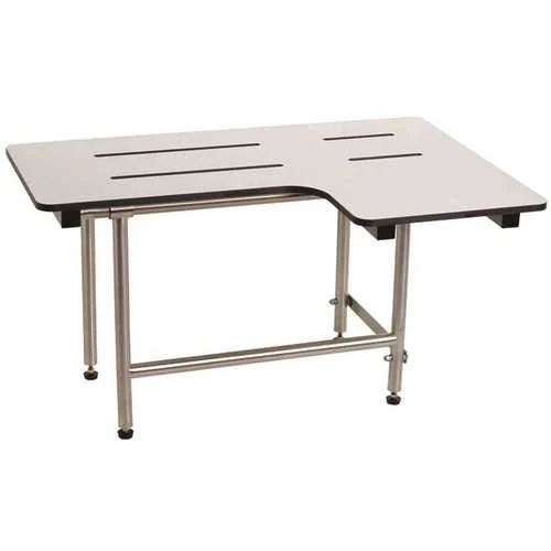 Reversible L-shaped Shower Seat exceeds the minimum 250 lb. load requirement per the 2010 ADAAG and 2017 ANSI Standards. This seat includes Lift-Assist Technology which complies with ADA Operation Code 309.4 of less than 5 lb. to operate. The frame of the bench is 18-8 (304) Stainless Steel and comes with a folding friction hinge for controlled and smooth transition from the wall to the floor with adjustable rubber feet from 17 to 19.